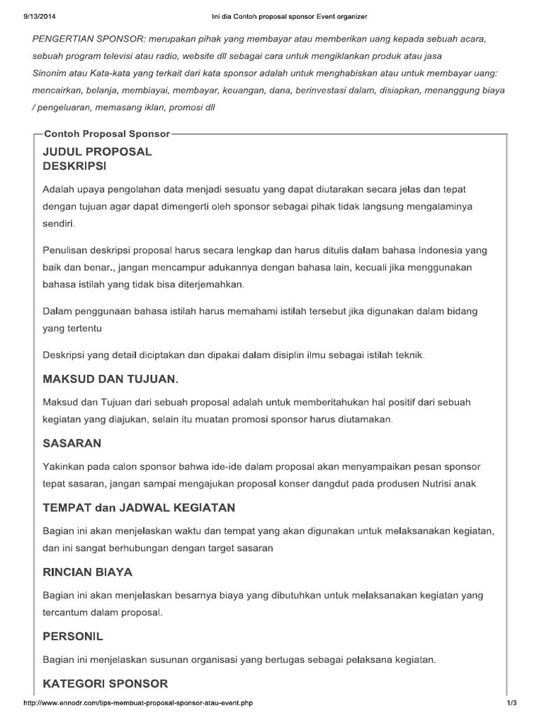 Contoh proposal event organizer pdf. Musik merupakan bahasa yang global dimana musik sebagai wujud menyampaikan perasaan situasi dan keadaan yang digambarkan secara imajinatif dengan satu keselarasan dan perekat satu kesatuan dan kebersamaan karena musik tidak. 15 th CONSAL Meeting and General Conference 2012 Exhibition and Sponsorhsip Proposal Page 1 of 10 PROPOSAL PAMERAN DAN SPONSOR KONFERENSI KE-15 CONSAL TAHUN 2012 CONSAL XV 2012 PENDAHULUAN Congress of Southeast Asian Librarians CONSAL merupakan suatu organisasi pustakawan se-Asia Tenggara yang didirikan di Singapura pada tahun 1970 sebagai tindak lanjut dari. An event proposal can help you close transactions and other deals.