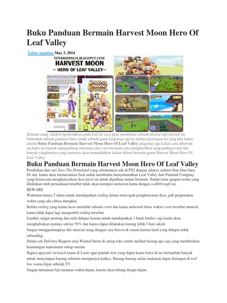 Panduan Lengkap Bermain Harvest Moon Hero Of Leaf Valley. Walktrough Harvest Moon Hero Of Leaf Valley buku mengandung informasi dari cara bermain cara menghasilkan uang event dan banyak yang lainnya yang tentunya akan memudahkan kalian dalam bermain game Harvest Moon Hero Of Leaf Valley Buku Panduan Bermain Harvest Moon Hero Of Leaf Valley Game ini merupakan Perubahan dari seri Harvest Moon.